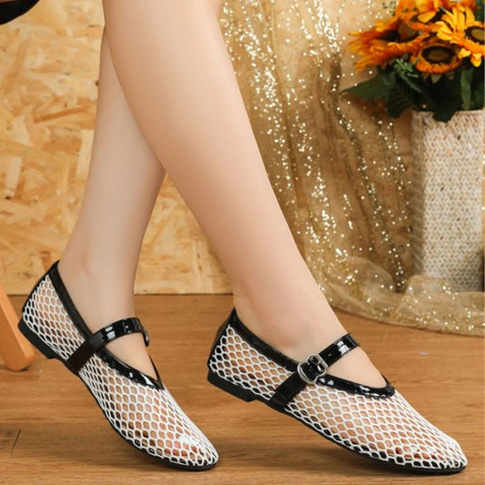 White Black Mesh Round Toe Buckle Strap Fishnet Ballet Flats