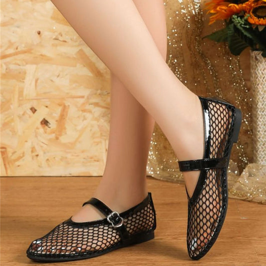 Black Mesh Round Toe Buckle Strap Fishnet Ballet Flats