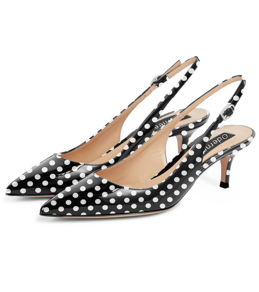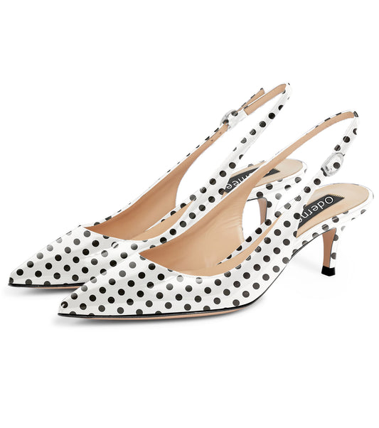 White Dots Pointed Toe Buckle Strap Kitten Low Heeled Sandals 2 Inch